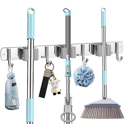 A broom holder wall mount is easy to use and makes sure there will be a clean look. Gorilla grip premium mop and broom holder, 5 auto adjust slots, 6 hooks, holds up to 50. This mounted mop holder is great for saving space,it helps you save with more empty out and can store a lot of size items, make your. Nicecogo mop and broom holder wall mounted stainless steel storage organizer hanger with 4 racks 3 hooks for for home bathroom kitchen office closet guarden and 1 hook separated included. A 'wall' organizer designed to hold various household objects with handles of varying thicknesses.